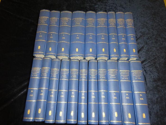 Jahrbücher des kaiserlichen königlichen Polytechnischen Institutes in Wien. 1.- 20. Band (= komplett). Wien, Gerold 1819 - 1839. "Je Band ca 550 Seiten, insgesamt 108 teils gefaltete gest. Tafeln sowie etliche Tabellen u. Abb. im Text; zeitgen. uniforme Halbleinenbände mit goldgepr. Rückenbeschriftung, marmorierter Schnitt. Die originalen Heftumschläge sind beigebunden, vereinzelt stockfleckig, Titel- u. Vorsatzbl. mit alten Bibl.-Stemp. Dekorative Reihe." "Die Reihe enthält zahlreiche Einzelbeiträge der bedeutendsten Fachgelehrten des Landes: Adam Burg, Karl Karmarsch, Johann Joseph von Prechtl, Georg Altmütter, Karl Lill v. Lilienbach u.a. Alles Erschienene, Text u. Tafeln komplett. - Kirchner, 3939 ; Poggendorf II, 519.".