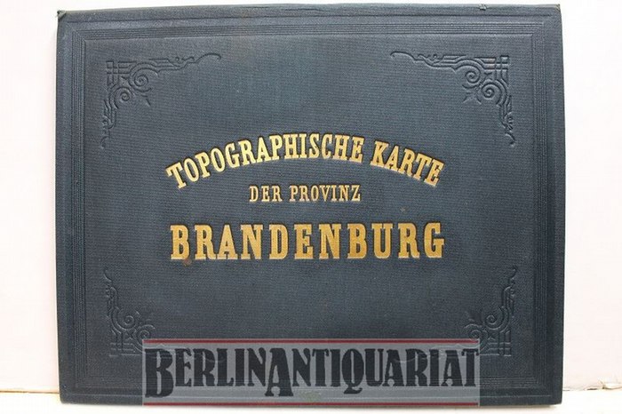 Topographische Karte der Provinz Brandenburg. Hand - Grenzcoloriert. Maßstab: 1: 300.000.  "Nach den Aufnahmen des K. Preuss: Generalstabs gez. von E. v. Cosel." 96 x 120 cm auf 16 Leinen-Segmenten.  Berlin, Dietrich Reimer, 1861. Gef. auf 4° quer. HANDCOLORIERT, s.a. Legende. Original Goldgeprägte Mappe!. Karte und Mappe sehr frisch, fast NEUWERTIG, auch sehr selten. Dekorative Einband-Mappe, nur die mit leichten Gebrauchsspuren, Schließbändchen fehlt. Auf der Karte mit einer Übersicht (Flächeninhalt zu Einwohnerzahl) und einer (Flächeninhalt zu Culturen Bezirk Potsdam). Siehe Fotos. Wie gesagt, ein Prachtexemplar.