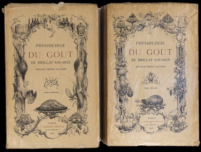 Physiologie du gout. Nouvelle édition illustrée. Paris, L. Carteret, 1923. 4°. 279 S.; 258 S. Mit 1 Porträt, 64 Radierungen von Léon Boisson und Louis Monzies nach Zeichnungen von Henri Pille und Maurice Leloir. Illustrierte Orig.-Broschuren mit Pergamin-Schutzumschlag. + Wichtig: Für unsere Kunden in der EU erfolgt der Versand alle 14 Tage verzollt ab Deutschland / Postbank-Konto in Deutschland vorhanden +, A|B 2 Bände. Monot 1962. ? Nr. VI von total 375 Exemplaren. ? Die Umschläge mit Gebrauchsspuren, Einrissen und vergilbt. Der unregelmässige Schnitt stärker gebräunt.