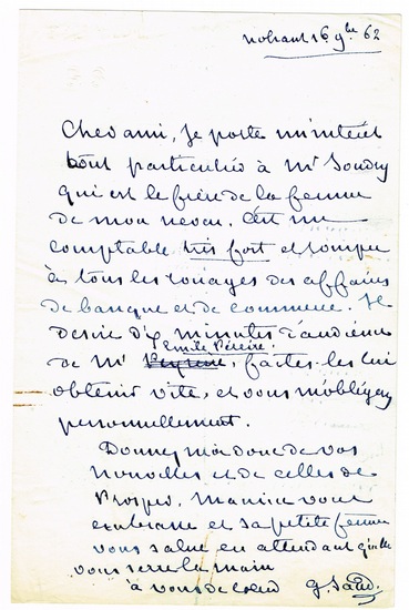 Autograph letter signed. no place, 16. XI. 1862. 8vo. 1 page. To her friend, the journalist and publisher Louis Jourdan, asking him to help a distant relative of hers named Mr. Soudry, who was seeking access to the banker and publisher Émile Pereire: "Je porte un intérêt tout particulier à M. Soudry qui est le frère de la femme de mon neveu. C'est un comptable très fort et rompu à tous les rouages des affaires de banque et de commerce. Il désire dix minutes d'audience de M. Emile Pereire. Faites les lui obtenir vite, et vous m'obligerez personnellement. Donnez moi donc de vos nouvelles et de celles de Prosper. Maurice vous embrasse et sa petite femme vous salue [...]". - Louis Jourdan directed the Journal des actionnaires that was close to the brothers Pereire. Jourdan's son Prosper (1840-66), also mentioned in the letter, was a journalist and writer. His 1862 verse novel Rosine et Roselle is dedicated to George Sand.