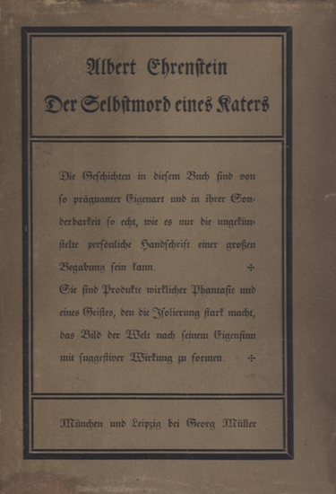 Der Selbstmord eines Katers. München Leipzig, Georg Müller, (1912). 8°. 219 S. 1 Bl. Rotschnitt. OPp. mit Rückenschild. OUmschl., 1. 1. Ausgabe dieser Sammlung von elf Erzählungen, Hauptwerken des österreichischen Expressionismus, die einzige Auflage unter diesem Titel. Mit dem schönen Deckelbezug von Buntpapier der Münchener Schule für Illustration und Buchgewerbe (Paul Renner / Emil Preetorius). Sein davor erschienener 'Tubutsch' mit den Illustrationen von Oskar Kokoschka war bei Jahoda & Siegel gedruckt worden. - WG 2; Raabe HB 3. Sehr gutes Exemplar mit dem ausserordentlich seltenen, professionell restaurierten Umschlag, textreich vorn und hinten mit Erwähnung und langem Zitat von Karl Kraus: '... Er ist einer von dem viel bemerkenswertern Stamme jener Asra, welche sterben, wenn sie leben'(!), ein auch von Friedrich Torberg verwendetes Zitat aus 'Der Asra' von Heinrich Heine [... wenn sie lieben]. Vorderer Vorsatz mit kleinem Besitzstempel.