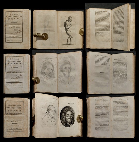 Physiognomische Fragmente zur Beförderung der Menschenkenntniss und Menschenliebe.  Verkürzt herausgegeben von Johann Michael Armbruster.  Winterthur, H. Steiners und Compagnie, 1783-1787. 8°. X, 246 S. Mit 91 (von 92) Tafeln auf 91 (von 92) Tafeln; 2 Bl., 329 S., (3) S. Mit 112 auf 114 Tafeln; 1 Bl., 320 S. Mit 150 (von 151) Tafeln auf 150 (von 151) Tafeln. Pappbände der Zeit. Band 1-3 (von 4). 1830 erschien ein 4. Band. - (Einbände beschabt. Name auf Titelblättern. Stockfleckig. Viele Tafeln mit Beschriftungen in Bleistift. Band 1: S. 113/114 nach S. 96 eingebunden. Im letzten Teil fehlt die Tafel 23. Band 3: S. 31/32 lose. Tafel 125 fehlt).