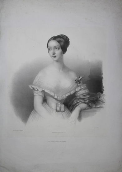 Portrait. Halbfigur mit schulterfreiem Kleid und hochgestecktem Haar. Großformatige Lithographie von Carl Wildt nach Friedrich L'Allemand. Berlin, Verlag Gropius, ca. 1855. Format (Bildbereich): 380 x 380 mm. Blattgröße: 710 x 580 mm. *Sehr seltenes Bildnis, nicht in den einschlägigen Portraitsammlungen. - Blattränder stärker angestaubt, das aufgewalzte Chinapapier mit leichten Beschabungen bzw. Papierschäden zu beiden Seiten des Gesichtes. - Prinzessin Luise war die einzige Tochter von Prinz Wilhelm von Preußen, dem späteren Deutschen Kaiser Wilhelm I. (1797-1888) und seiner Frau Prinzessin Augusta von Sachsen-Weimar-Eisenach (1811-1890). Im Mai 1855 wurde sie mit dem damaligen Prinzregenten Friedrich von Baden (1826-1907) bekannt gemacht. Im September 1856, wenige Tage nach seiner Proklamation zum Großherzog von Baden, heiratete sie im Berliner Stadtschloss den badischen Großherzog Friedrich I und wurde damit Großherzogin von Baden.