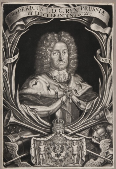 Portrait. Brustfigur en face, unten mit Wappen und Insignien. Mezzotinto von Elias Christoph Heiss (1660-1731). Augsburg, ca. 1720. Format: 33 x 22 cm (mit kleinem Rändchen um die Plattenkante und in alter Zeit flächig auf getöntes Untersatzpapier montiert). *"Friedrich (* 11. Juli 1657 in Königsberg; ? 25. Februar 1713 in Berlin) aus dem Haus Hohenzollern war ab 1688 als Friedrich III. Kurfürst von Brandenburg und souveräner Herzog in Preußen. Dort erhöhte er sich 1701 als Friedrich I. zum König in Preußen. Nach der Herrschaftsübernahme in Brandenburg-Preußen am 9. Mai 1688 setzte Friedrich, der aufgrund seiner Skoliose volkstümlich Schiefer Fritz genannt wurde, die Innen- und Außenpolitik seines Vaters Friedrich Wilhelm fort." (Wikipedia).