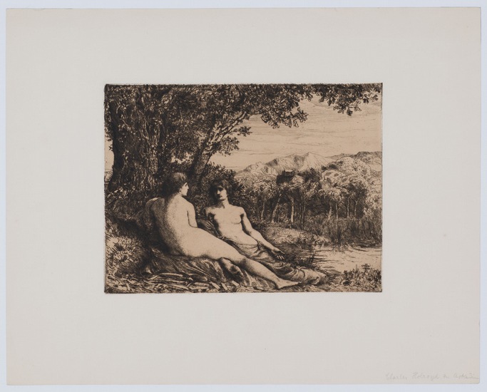 In Arkadien. _. Radierung in Schwarz-Braun mit Plattenton, 1907, auf chamoisfarbenem Kupferdruckpapier. 26,6:19 cm. Erschienen in: Zeitschrift für Bildende Kunst, 1907. ? Vorzüglicher und vollrandiger Abdruck mit viel Grat!. Der spätere Kurator, war 1897-1906 keeper at Tate Gallery, London; 1906-1916 Director of National Gallery, London) und Künstler war Schüler von Alphonse Legros (1837-1911) und ging nach 1885 für zwei Jahre nach Italien, wo er seiner Frau begegnete, die er 1891 heiratete. Nach seiner Rückkehr lehrte er auf Einladung von Legros als sein Assistent an der Slade School. Mit seiner außergewöhnlichen Fähigkeit als Radierer erwarb er sich auf diesem Gebiet große Reputation.