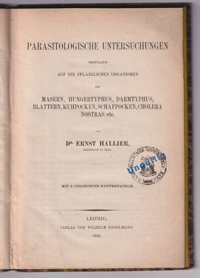 Parasitologische Untersuchungen bezüglich auf die pflanzlichen Organismen bei Masern, Hungertyphus, Darmtyphus, Blattern, Kuhpocken, Schafpocken, Cholera Nostras etc. [Mit den colorierten Kupfertafeln]. Leipzig, W. Engelmann, 1868. Einzige Ausgabe. Marmorierter Pappband, schwarzer Rücken, rotes Rückenschild, gr-8°, 2 gefaltete, farbig gestochene Tafeln, VI, 1 Bl, 80 S.;- Rücken mit 2 kleinen Fehlstellen, Ecken gering bestoßen, leicht gebräunt, Exlibris, Titel mit Stempel des Hamburger Gesundheitrates. - Hallier [1831 in Hamburg-1904 in Dachau] war gelernter Gärtner und arbeitet in in diesem Beruf in Berlin; in Jena studierte er Botanik und begann dort auch zu Lehren, bis 1884 war er Professor für Botanik [Wikipedia]; er *pflegte besonders die Grenzgebiete zwischen Medizin und Biologie. Durch Lehraufgaben war er auf Parasitologie, Pharmakognosie und medizinisch-pharmazeutische Botanik gewiesen worden, wo er vor allem als Hochschullehrer Bedeutendes leistete. Seine Pionierarbeit auf den Gebieten der mikroskopischen Pflanzenpathologie und Mykologie wurde von seinen Zeitgenossen mehr beachtet als seine Bemühungen um die Pflanzensystematik* [NDB 7, S. 563f.]. - Pritzel 3738. - Jubiläumskatalog Engelmann (1911) S. 141.