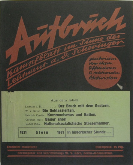 Kampfblatt im Sinne des Leutnants a.D. Scheringer. 1. Jahrgang Nr. 1 Juli 1931. Berlin, 1931. 15 S. 4°, OBrosch. 1. Nummer dieser zwischen 1931 und 1933 erschienenen Zeitschrift. (Eberlein 1375, nicht bei Seywald). Die unter der Schriftleitung des ehemaligen Freikorpsführers Beppo Römer vom Militärpolitischen Apparat der KPD herausgegebene Zeitschrift versuchte nach dem Vorbild des 1931 zur KPD übergetretenen NS-Reichswehroffiziers Richard Scheringer (1904-1986) nationalgesinnte, NS-kritische Kreise für die KPD-Politik Anfang der 30er Jahre zu gewinnen. Scheringer wurde im Herbst 1930 wegen nationalsozialistischer Umtriebe im Offizierskorps im sog. Ulmer Reichswehrprozess zu anderthalbjähriger Festungshaft verurteilt. Nach seiner Abkehr vom NS und Hinwendung zur KPD wurde ihm im April 1932 der Prozess nun wegen seiner KPD-Tätigkeit gemacht. Das Reichsgerichtsurteil von zweieinhalb Jahren Festungshaft wurde durch eine Begnadigung nicht vollstreckt. Enthält u.a.: Heinrich Kurella ? Kommunismus und Nation ; Christian Klee ? Bauer ahoi ; Rudolf Brehm ? Nationalsozialistische Stresemänner. - Heft mit aufgeklebten original Kurzinhaltsverzeichnis, sonst guter Zustand.