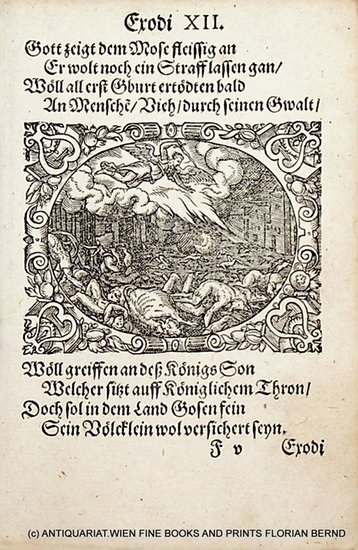 Exodus 12 1571. original Holzschnitt von Jost Amman auf der ganzen Buchseite mit ornamentaler Umrahmung, Darstellung ca. 5,5 x 7 cm, verso weiss / original woodcut by Jost Amman on the whole book page with ornamental framing, image ca. 5,5 x 7 cm, verso blank. original Blatt aus Rebenstock: Neuwe Biblische Figuren etc. Feyerabend 1571 [VD16 R 436] vgl. Andresen: Der deutsche Peintre-Graveur I, 296, Jost Amman No. 182; 301, II.
