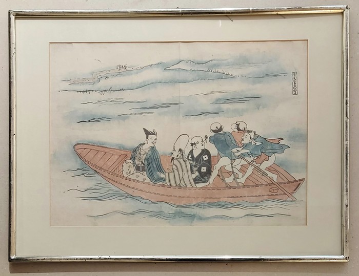Fähre. Holzschnitt, Abzug von ca. 1820, handkoloriert. _. Bildgrösse: 28x39 cm. Gerahmt (38,2x51,5 cm). Mit einem Mittelfalz, rechts davon mit Knitterspur.