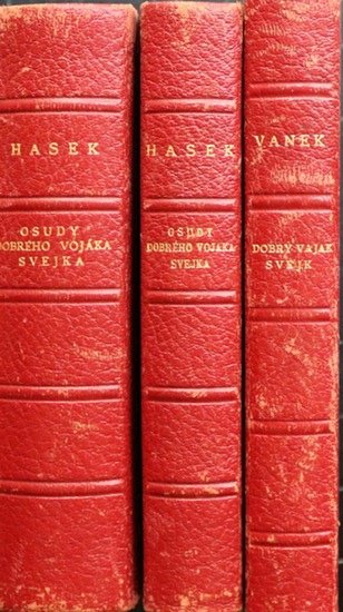 Osudy dobrého vojáka Svejka (Die Abenteuer des braven Soldaten Schwejk) za svetove valky / v ruskem zajeti. Dil.I - VI. Praha, Nakladatel Karel Synek, 1926. Erschienen 1926 - 1937. Illustroval Josef Lada. Drei Halblederbände der Zeit mit goldgeprägtem Rückentitel. 263, 268, 267, 266, 259, 249, 212,50 Seiten. Rücken und Ecken teils etwas berieben, Exlibris auf Vorsatz, sonst gut und sauber erhalten. Karel Vanek beendete den Schweik-Roman von Jaroslav Hasek. Bei Band 1 und 2 der farbige vordere OUmschlag von Josef Lada beigebunden. Bei Band 3 wurde der farbig illustrierte OUmschlag von John Heartfield (Vorder- und Rückseite) ebenfalls beigebunden.