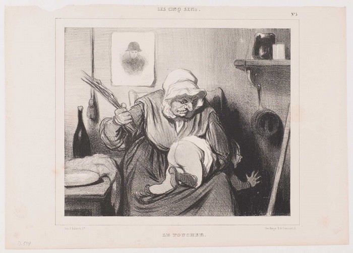 LE TOUCHER. _. (DER SPÜRSINN.). Lithographie, auf chamoisfarbenem Velin, mit den Adressen: Imp. d?Aubert & Cie., sowie: Chez Bauger R du Croissant 16. Blattgröße 25:35,8 cm. ? Fehlstelle im Oberrand links, jedoch ohne Bildverlust. Literatur: Daumier-Register 598; Delteil 598, Blatt 5 der Serie ?Les cinq Sens.?, erschienen 15.09.1839 in ?La Caricature?. ? Sur blanc!. TYPES PARISIENS. (Pariser Typen) ist eine Serie von 50 Lithographien, welche zwischen Oktober 1840 und Januar 1843 im LE CHARIVARI erschienen sind. Die Blätter DR 502 und 503 erschienen separat im Jahre 1838. Zuvor erschienen die Blätter 1 bis 42 dieser Serie im Jahr 1839 bis 1840 in LA CARICATURE PROVISOIRE und LE FIGARO.
