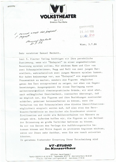 Eigenh. Vermerk und Unterschrift auf einem an ihn gerichteten Schreiben. ohne Ort, 21. VII. 1986. 4to. 1 1/2 pp. Gefaltet. Eigenh. Ablehnung mit Unterschrift auf einem an ihn gerichteten Schreiben des Volkstheaters in Wien, die Becketts ?Endspiel? in einer ungewöhnlichen Besetzung aufführen wollten. ?Wir möchten Hamm und Clov von zwei Schauspielerinnen, Nagg und Nell von zwei jungen Darstellern, wahrscheinlich zwei jungen Männern spielen lassen.? Allerdings haben sie ?keineswegs vor, aus ,Endspiel? ein sogenanntes Frauenstück zu mcachen, sondern die Figuren möglichst genau dem Text entsprechend zu zeigen, nur eben von Gegenbesetzungen.? - Beckett lehnt diesen Vorschlag kurz ab ?I cannot accept this proposal. I regret.?.