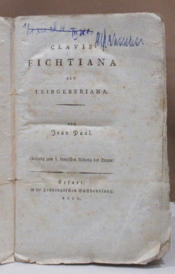 Clavis Fichtiana seu Leibgeberiana. (Anhang zum 1. komischen Anhang des Titans). Erfurt, Henningssche Buchhandlung 1800. 1800. XVI,174 S. und 1 S. Druckfehler, schlichte Broschur der Zeit. Erste Ausgabe.- WG. 16; Berend/Krogoll 15.- Eintrag mit Tinte oder Kugelschreiber, leicht stockfleckig, Einband begriffen und etwas knickspurig, völlig unbeschnittenes und breitrandiges Exemplar.