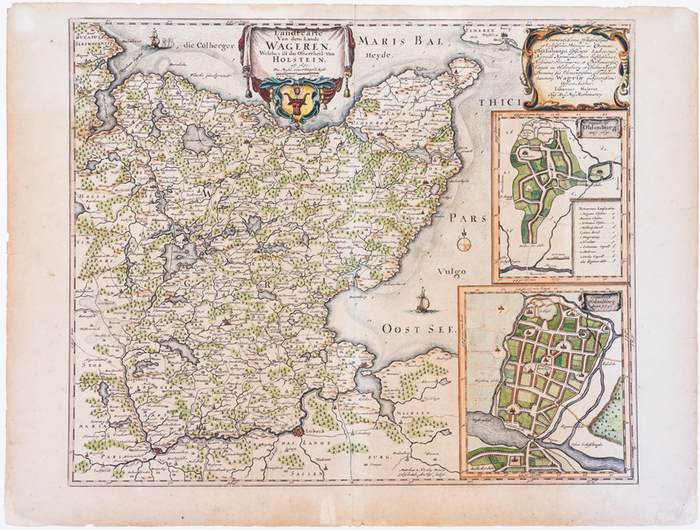 Landtcarte von dem Lande Wagrien. Welches ist das Ostertheil von Holstein. - Husum:, Danckwert, 1652. Altkolorierter Kupferstich 42 x 51 cm, Blattgröße 47 x 61,5 cm. Die Landkarte zeigt das Gebiet Ostholstein zwischen Kiel und Lübeck. An der rechten Seite zwei Grundrisse von Oldenburg 1320 und 1651. Oben mittig die Titelkartusche, oben rechts eine weitere Kartusche mit Erklärungen und dem Namen Johannes Mejer, Autor. - Aus: Neue Landesbeschreibung der zwei Herzogtümer Schleswig und Holstein. - Das Papier leicht gebräunt, im Bereich des Mittelfalzes etwas heller. Ein Einriss außerhalb des Bildes geklebt. Das Altkolorit sorgfältig, ein schönes Blatt.