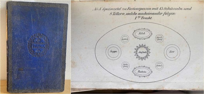 Sailer`sches Familien-Handbuch. Ein vollständig belehrendes Werk für Küche und Haushaltung in 1200 Recepten der vorzüglichsten Speisen aller Nationen sammt Anweisung der Aufbewahrung von Gemüsen und Früchten. Mitt teils gefalt. Tafeln. München, Deschler, 1865. XII, 271 Seiten, 6 Bll. Verzierter Pappband d. Zt. (Schulpreis-Band) (Kanten und Gelenke beschabt). Theoertisch-praktische Anweisung in der neueren und feineren Kochkunst zur Servirung der Speisen für Dejeuner, Diner und Souper, dann Tranchirkunst ... Speisezettel zu allen Wochen und Monaten im Jahre. - Erste Ausgabe, selten. - Weiss 2860 - Horn/A. 576 - Teils stärker stockfleckig. OB1-122.