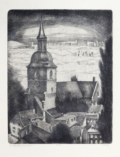 Stiftskirche St. Arnual mit Blick zum Eschberg. Radierung, 1973. 32x24,5 cm *Handschriftlich signiert, datiert und mit "P.A." (Probeabzug)bezeichnet, zusätzlich in der Platte monogrammiert und datiert.