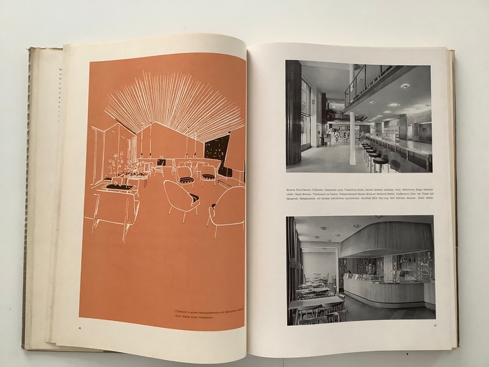 Der Innenausbau. Gaststätten und Läden 1. Band. Ein FAchbuch für Architekten und Handwerker. Stuttgart, Kohlhammer, 1955. 39 : 27,5 cm. 279 pages, including 143 pages of drawing and 245 illustrations on 128 plates. Original cloth with original, illustrated dust-jacket. detailed handbook for architexts and construction workers. With very detailled illustrations.