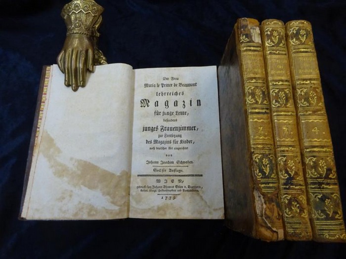 Lehrreiches Magazin für junge Leute, besonders junges Frauenzimmer, zur Fortsetzung des Magazins für Kinder nach deutscher Art eingerichtet von Johann Joachim Schwaben. 6. Auflage. (1)-4. Theil. Wien, Trattner 1775. "4 Bde. Kl.8°. I-XVIII S., S. XXIII-XXV, 198 S., S. XIX-XXII, S. 199-202; 242 S.; 239 S.; 282 S., mit Kopfstücken, Initialen u. Schlussvignetten. Marmorierte Lederbände d. Zeit, Rückenschildchen u. Rückenverzierung mit floralen Motiven in Goldprägung, mit zweifachen Streicheisenlinien auf den Einbanddeckeln Vorsätze aus dekorativem zweifärbig bedrucktem Buntpapier, Buchschnitte rot marmoriert, kaum bestoßen, berieben, Rücken des ersten u. zweiten Bandes mit Fehlstellen. Im Text leicht braunfleckig, einige Tintenflecken, Ss. XIX-XXII d. ersten Bandes falsch eingebunden." "Vgl. VD18 11301929. Querard 5,198. ADB 33,162ff.; vgl. Wegehaupt I, 1262; Fromm 14974. Erster bis vierter Teil eines Wiener Nachdrucks in sechster Auflage (die Titelblätter des zweiten und vierten Teils tragen keine Auflagenbezeichnung) der deutschen Ausgabe des ?Le Magasin des adolescentes? - in französischer Sprache erstmals erschienen 1760 - v. J. M. Leprince De Beaumont (1711-1780). Eines der berühmtesten Kinderbücher der Aufklärung. Das Werk der erfolgreichen Autorin, Erzieherin und Gouvernante in adeligen Häusern, wurde in die meisten europäischen Sprachen übersetzt und vielfach herausgegeben. Der Gelehrte Johann Joachim Schwabe (1714-1784), der die deutsche Übersetzung besorgte, war ein Anhänger Gottscheds, u. bemühte sich besonders um Übersetzung und Verbreitung pädagogischer Literatur.".