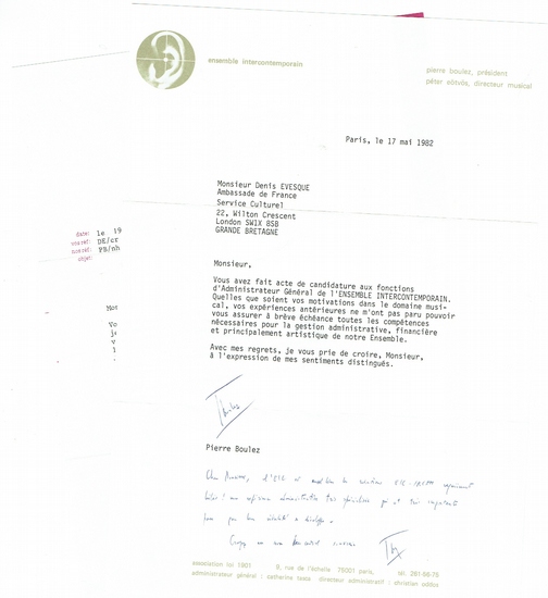 2 typed letter signed. Paris, 1978 and 1982. 4to. 2 pp. Printed letterhead ?L'Ircam, Centre Georges-Pompidou? and ? l'Ensemble Intercontemporain, Pierre Boulez Président?. Paris, January, 19, 1978.He regrets not being able to give a lecture. "Votre aimable lettre du 11 janvier vient de me parvenir et je m'empresse de vous faire part de mes regrets de ne pouvoir accepter votre invitation de donner une conférence à l'Institut Français de Vienne."Paris, May, 17, 1982 He announces the rejection of the application for the position of General Administrator. "Vous avez fait acte de candidature aux fonctions d'Administrateur Général de l'Ensemble Intercontemporain. quelles que soient vos motivations dans le domaine musical, vos expériences antérieures ne m'ont pas paru pouvoir vous assurer à brève échéance toutes les compétences nécessaires pour la gestion administrative, financière et principalement artistique de notre Ensemble" Handwritten addition signed by Boulez: "l'EIC et aussi bien les relations EIC-IRCAM requièrent hélas ! une expérience administrative très spécialisée qui est très importante pour que leur vitalité se développe".