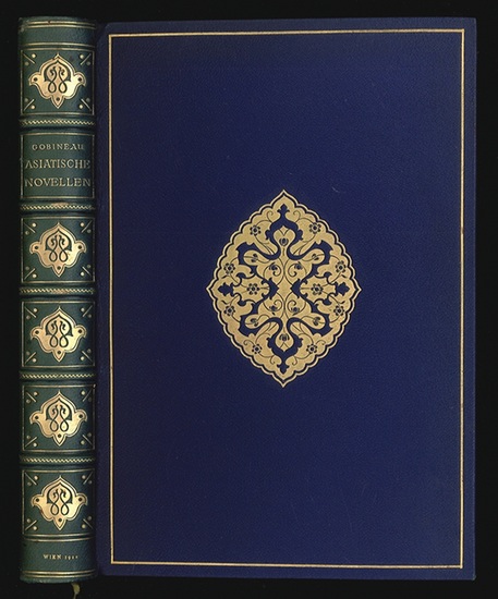 Asiatische Novellen. Wien, Schroll (1922). 295 (1) S. Mit Initialen u. 10 farblithogr. Taf. v. Armin Horovitz. Blaue OLdr.-Bd. m. Goldpräg., Steh- u. Innenkantenvergold., Kopfgoldschnitt. In tadellosem Zustand. Eines v. 150 num. Exemplaren der Vorzugsausgbe auf Japan-Dokumentenpapier, von Bakala mit der Hand in Bocksaffianleder gebunden. Aus dem Französischen übers. v. Ernst Klarwill.