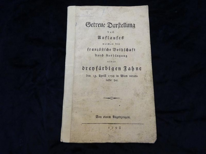 Getreue Darstellung des Auflaufes, welchen die französische Bothschaft durch Aushängung einer dreyfärbigen Fahne den 13. Aprill 1798 in Wien veranlasset hat. Von einem Augenzeugen. Ohne Ort (vermutl. Wien) u. Verl. 1798. Kl.-8°. 30 S. (Tit. in Pag.). Ohne Umschlag, am Rücken m. Papierstreifen verstärkt. Titelblatt angeschmutzt, Exlibris (Theodor Karajan) verso Titel, mehrf. gestemp., durchgeh. etw. abgegriffen. Holzmann-Bohatta I, 10607 (hier Karol Fryderyk Glave-Kolbielski als Verf.) u. Holzm.-Boh. VII, 2591 (hier Franz Joseph von Saurau als Verf.) - Anonym verfasster Bericht über den antifranzösischen 'Fahnentumult'. Urheber dürfte der österreichische Politiker Franz Josef von Saurau sein, der seit 1795 Regierungspräsident von Niederösterreich war und einer der wichtigsten Berater von Kaiser Franz II. - 1798 hatte Jean Baptiste Bernadotte (nachmals König von Schweden und Norwegen) als diplomatischer Vertreter der französischen Revolutionsregierung in Wien das Geymüllerpalais in der Wallnerstraße gemietet. Als er (als begeisterter Republikaner) am 13. April 1798 anläßlich eines Fests vom Balkon des ersten Stockwerks die Fahne der Französischen Republik wehen ließ, entstand ein Auflauf. Die verhaßte Trikolore wurde von einer aufgebrachten Menschenmenge heruntergerissen und verbrannt. Bernadotte verließ am nächsten Tag Wien. - In dt. Sprache sind mehrere Varianten und Ausgaben nachgewiesen. Unser Exemplar hat am Titelblatt eine Zierleiste mit Kugel.
