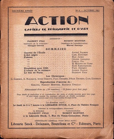 Action - Cahiers individualistes de philosophie et d'art. JG. 2 / No. 9 / Oct. 1921 (apart). Red.: Florent Fels & Robert Mortier. Paris. 2 Bl., 30, (5) S. Mit 10 s/w Abb. auf Tafeln. 24 cm. OBroschur. Darin: Gazette de l'Étoile (André Salmon), L'Art nègre (Carl Einstein), Gedichte von Max Jacob, Céline Arnauld, Pascal Pia, Martin du Gard, Élie Ehrenbourg, L'avenir de la violence (Alexis Danan) u.a.m. Die Tafeln mit Reproduktionen von Kisling, Maurice Utrillo u.a. - Umschlag zeitbedingt gebräunt u. brüchig. Unbeschnitten.