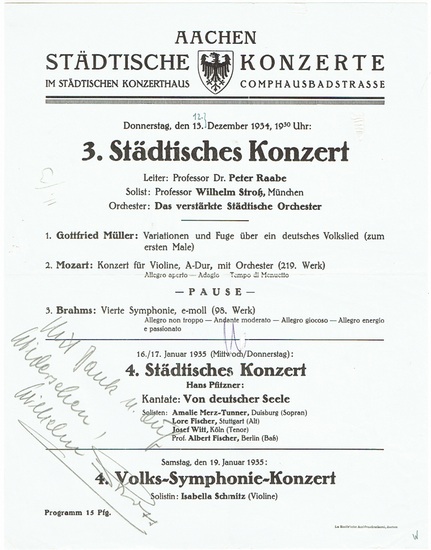 Programm mit eigenh. Unterschrift.   Aachen, 13. XII. 1934. 4to. 1 p. Eigenh. Unterschrift auf einem Programm im Städtischen Konzerthaus in Aachen. Gespielt wurden an diesem Abend Gottfried Müller, Mozart und Brahms. Faltspuren.
