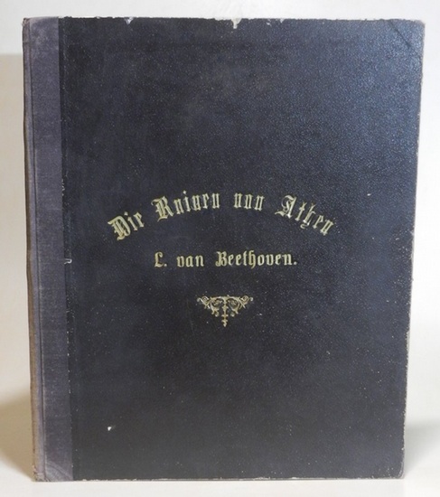 Die Ruinen von Athen. Fest- und Nachspiel von A. von Kotzebue. Musik von L. van Beethoven. Op. 113. Klavierauszug mit Text von F. Brissler. Mit Bewilligung der Original-Verleger Herren Artaria & Co in Wien. Gestochene Noten, Plattennummer 10885.   Leipzig: Breitkopf & Härtel ohne Jahr. Titelblatt und 56 Seiten. Halbleindwand der Zeit mit Deckelgoldtitel (berieben und bestoßen, auf dem Titelblatt rechts oben ein alter Schulstempel, auf dem vorderen Innendeckel handschriftliche Annotationen, der Buchblock zweimal gebrochen, das Blatt mit den Seiten 13/14 lose, auf den Seiten 40 und 41 kleine Annotationen in Kopierstift,.