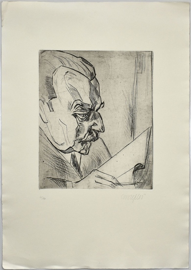 Bildnis Wölflin II. [Signierte Original-Radierung / signed original etching]. _. (Fritz Schaefler, geboren am 31. Dezember 1888 in Eschau im Spessart, gestorben am 24. April 1954 in Köln. Deutscher Maler und Grafiker des Expressionismus. Studium ab 1906 an der Königlichen Kunstgewerbeschule, ab 1908 an der Königlichen Kunstakademie in München, Schüler bei Angelo Jank. Ab 1917 entstanden expressive Holzschnitte und Radierungen. Schaefler gehörte jetzt zur Münchner Avantgarde, beteiligte sich 1918/19 an der Münchner Revolution, wurde Mitglied und Schriftführer im "Aktionsausschuss Revolutionärer Künstler"). Nummer 41 von 100 nummerierten Original-Radierungen aus dem Nachlass auf Büttenpapier. Unterhalb der Abbildung mit Nachlasssignatur in Blei. Die Radierung zeigt den Schweizer Kunsthistoriker Heinrich Wölfflin (geboren am 21. Juni 1864 in Winterthur; gestorben am 19. Juli 1945 in Zürich). Maße Abbildung: 39,5 x 32,7 cm. Maße Blatt: 76,0 x 53,5 cm. Ecken mit Knickspuren. Insgesamt noch sehr gutes Exemplar. Number 41 of 100 numbered original etchings from the estate on handmade paper. Below the image with the estate signature in lead. The etching shows the Swiss art historian Heinrich Wölfflin (born on June 21, 1864 in Winterthur; died on July 19, 1945 in Zurich). Image dimensions: 39.5 x 32.7 cm. Sheet dimensions: 76.0 x 53.5 cm. Corners with creases. Overall still a very good copy.