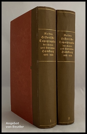 Historische Topographie der Freien und Hansestadt Hamburg von 1895 - 1920. Mit Nachträgen bis 1923 bzw. 1924. Unter Benutzung amtlicher Quellen. Hamburg, Meißner, 1923/25. 2 Bände. Gr. 8°. VII, 664 Seiten (Band 1) und IX, 688 Seiten. (Band 2). Halbleinen. (Band 1 an der Kante etwas gestoßen, kleine Fehlstelle am Deckelbezug, Papier etwas gebräunt - Kartenbeilage fehlt). -- Kartenbeilage fehlt leider. -- Jeweils Besitzerstempel des Verfassers auf dem Titelblatt. Anbei drei maschinenschriftliche Seiten mit Druckfehlerberichtigungen, die - so darf man annehmen - von Melhop selber stammen, der dieses Exemplar in seinem Besitz hatte.