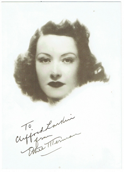 Portraitphotographie mit eigenh. Widmung und Unterschrift. ohne Ort und Datum. 124 : 174 mm. Frühes Brustbild von vorn. Merman wurde einer der großen Stars des Broadway. 1930 debütierte sie dort in dem Musical Girl Crazy. Zahlreiche musikalische Komödien (Musical Comedy) wurden durch sie zu Kassenschlagern, von denen man etliche verfilmte. Ausgestattet mit einem großen Stimmvolumen, war sie eine Vorgängerin späterer Stars wie Judy Garland und Barbra Streisand. Die Komponisten Irving Berlin und Cole Porter schrieben zahlreiche Songs speziell für sie.