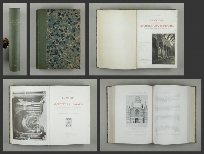Le Origini della Architettura Lombarda e delle sue principali derivazioni nei Paesi d'Oltr' Alpie. Milano, Ulrico Hoepli., 1908. 26,5x19 cm. 785 S. con 618 incioni intercalate nel test ed una tavola fuori testo. Halbleinwandband mit goldgeprägtem Rückentitel. Originalbroschur mit eingebunden. "Seconda edizione, corretta ed ampliata." - Einband an den Kanten etwas berieben. Broschurumschlag und letztes Blatt leicht stockfleckig.