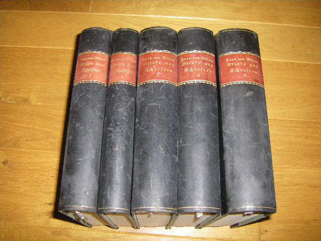 Briefe und Schriften. (Band) III. - VII. Band (5 Bände) Leipzig, Breitkopf & Härtel, 1900. 5 Bände; 1900 - 1911; Band III: Ausgewählte Schriften, 1850 - 1892, 1. u. 2. Abteilung, XXIX, 363, 319 S. (2. vermehrte Aufl. 1911); Bd. V: Briefe Bd. IV, 1864 - 1872, XII, 582 S., mit 1 Bildnis ( 1. Aufl. 1900); Bd. VI: Briefe Bd. V, 1872 - 1880, XX, 641 S., mit 2 Abb. (1. Aufl. 1904); Bd. VII: Briefe Bd. VI, Meiningen, 1880 - 1886, XXIV, 422 S., mit 3 Abb. (1. Aufl. 1907); Bd. VIII: Briefe Bd. VII, Höhepunkt und Ende, 1886 - 1894, XXI, 492 S., mit 2 Bildnissen (1. Aufl. 1908);herausgegeben von Marie von Bülow; Kopfgoldschnitt; Bd. VIII mit angeplatzten Aussengelenken, Lederrücken teils etwas beschabt Halbleder 21,2 cm Befriedigend.