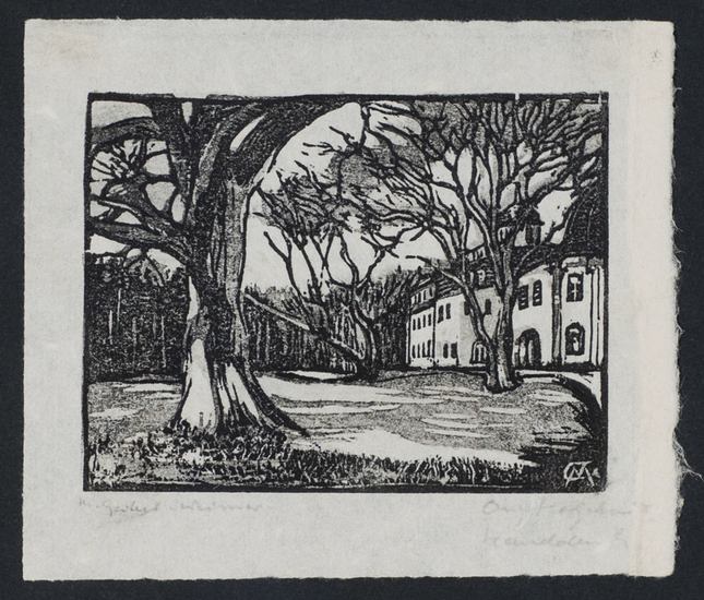Große Platane.   _. Farbholzschnitt in Schwarz und Grau, 1935, auf Japan, im Stock monogrammiert, mit Bleistift signiert und als ?Orig. Holzschnitt Handdruck? bezeichnet. Darstellungsgröße 6,8:9 cm, Blattgröße 9,7:11,3 cm. Werknummer 275. Blatt XIII zum Zyklus: Belvedere, Weimar. Literatur: Katalog: Margarethe Geibel 1876-WQeimar-1955. Farbholzschnitte. Obeerursel/Ts., Joseph Fach GmbH, 2021, Nr. 2, 13. Die Tochter des Porträt- und Landschaftsmalers Casimir Geibel (1839-1896) wuchs unmittelbar gegenüber von Goethes Wohnhaus in Weimar auf. Die Schauplätze und geistigen Zentren der Weimarer Klassik, vorrangig das Goethehaus, wurden zu ihren künstlerischen Lebensthemen. In Weimar zunächst Unterricht an der Freien Zeichenschule und ab 1896 im Privatatelier von Otto Rasch (1862-1952), dem Leiter der grafischen Abteilung der Weimarer Kunstschule. 1900-02 in Stuttgart Studium an der privaten Kunstschule von Leopold von Kalckreuth (1855-1908). 1902 Rückkehr nach Weimar, wo sie sich die Technik des Farbholzschnitts autodidaktisch aneignete., die sie zeitlebens favorisieren sollte. Geibel erlangte Anerkennung durch Ankäufe von privaten und öffentlichen Sammlungen z. B. in Weimar, Dresden, Stuttgart, München, Berlin, Budapest, Wien (Hofbibliothek) und London (Kensington Museum und British Museum). (Zit. aus: Ausst. Katalog: Wege zu Gabriele Münter und Käthe Kollwitz. Holzschnitte von Künstlerinnen des Jugendstils und des Expressionismus. Reutlingen, 2013, S. 146).
