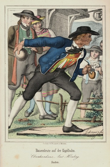 Das deutsche Volk in seinen Mundarten, Sitten, Gebräuchen, Festen und Trachten geschildert. Leipzig, Georg Wigand 1847. * Mit 50 kolorierten lithographischen Trachten-Tafeln von Julius Döring, Meno Mühlig und Karl Wilhelm Schurig. 332 Seiten, 1 Blatt. 22,5 x 15,5 cm. Violetter Leinenband der Zeit (Rücken verblichen, etwas fleckig) mit hübscher Romantiker-Rücken- und -Deckelvergoldung. *** Goedeke XII, 224, 44. Rümann 2346. Lipperheide I, 737. - Erste Separatausgabe; Auszug aus Eduard Dullers (1809-1853) größerem Werk "Deutschland und das deutsche Volk" (1845). - Gesuchtes Illustrationswerk mit prächtigen Trachtenbildern. Die fein kolorierten Tafeln zeigen zumeist zwei Personen mit landschaftlichem Hintergrund. - Vorderes Innengelenk gering gelockert. Gelegentlich etwas gebräunt und braunfleckig. - Im Ganzen gutes Exemplar mit sämtlichen Tafeln.