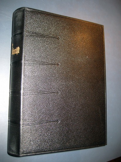 Die Bibel oder die ganze heilige Schrift des Alten u. Neuen Testaments nach der deutschen Übersetzung Martin Luthers. Durchges. im Auftrag der Deutschen Evangelischen Kirchenkonferenz. Kleinquart-Ausgabe. Stuttgart, Württ. Bibelanstalt 1954. 4°. 1008, 334, 77 S. Mit Abb. und Karten auf 16 Tafeln. Original-Lederband mit Goldschnitt und Innenkantenvergoldung in Schuber. Gutes Exemplar.