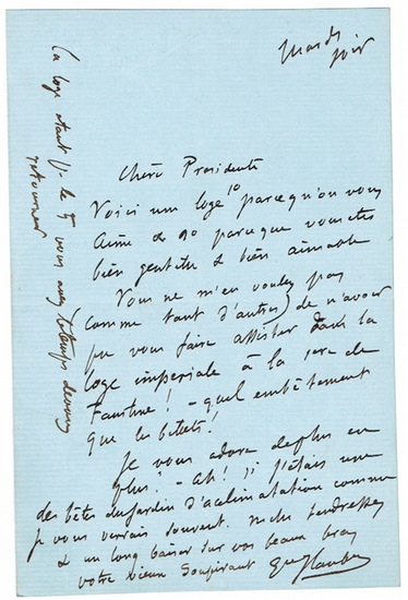 Eigenhändiger Brief mit Unterschrift. [Paris], ?Mardi soir? [23. Februar 1864]. 8vo. 1 p. Blaues Papier. Schöner Brief, über die Entstehung des Dramas ?Faustine? seines Freundes Louis Bouilhet (Porte Saint-Martin, 20 février 1864). ?Chère Présidente, Voici une loge 1° parce qu?on vous aime & 2° parce que vous êtes bien gentille & bien aimableVous ne m?en voulez pas (comme tant d?autres) de n?avoir pu vous faire assister dans la loge impériale à la 1ère de Faustine! ? quel embêtement que les billets! Je vous adore de plus en plus! ? Ah! si j?étais une des bêtes du Jardin d?acclimatation comme je vous verrais souvent. Mille tendresses et un long baiser sur vos beaux bras'Votre vieux soupirant [?]? - Correspondance (Pléiade), t. III, p. 379.