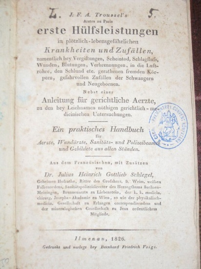 J.F.A. Troussel's Arztes zu Paris erste Hülfsleistungen in plötzlich-lebensgefährlichen Krankheiten und Zufällen, namentlich bey Vergiftungen, Scheintod, Schlagfluss., Wunden, Blutungen... Nebst einer Anleitung für gerichtliche Aerzte zu den bey Leichnamen nöthigen gerichtlich-medicinischen Untersuchungen - Ein praktisches Handbuch fur Aerzte, Wundärzte, Sanitäts- und Polizeibeamte und Gebildete aus allen Ständen. Bernhard Friedrich Voigt, Ilmenau, 1826. 8° (20,4 x 12 cm). Interimsbroschur mit verblasstem, handschriftlichen Rückenschild. Die Einbandpappe leicht fleckig, kleinere Einrisse im unteren Rückenbereich. Ein Ex-Libris und eine kleine Buchhändlermarke im Innendeckel, das Titelblatt mit kleiner Signatur in alter Tinte und einem Stempel eines ungarischen Premonstratenserordens. XIV, 361 Seiten. Der Innenteil nur sehr leicht braunfleckig, die ersten und letzten Seiten etwas stärker, der Satzspiegel etwas gebräunt. Der Band innen eintragungsfrei, die Seiten fest. Siehe auch weitere Abbildungen. Ganz guter Gesamtzustand. FL2216.