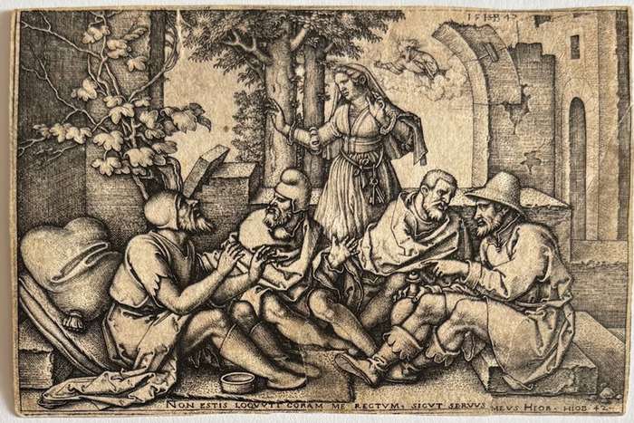Hiob im Gespräch mit seinen Freunden. _. Original-Kupferstich, 1547. Ca. 70 x 105 mm (Blattformat). B. 16.; Hollstein 17 II (von II), mit den Gräsern auf dem abgebrochenen Stück des Torbogens oben rechts. Schöner und kräftiger Abdruck auf fein strukturiertem Bütten, umlaufend überwiegend auf der Einfassungslinie beschnitten. Fachmännisch restauriert. Insgesamt gut erhalten.