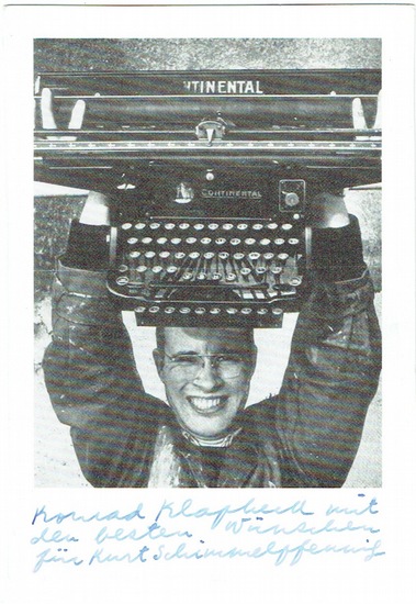 Portraitpostkarte mit eigenh. Widmung und Unterschrift. ohne Ort und Datum. 100 : 150 mm. Brustbild von vorn mit Schreibmaschine.