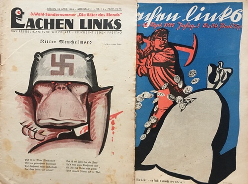 LACHEN LINKS. Das republikanische Witzblatt. 1. Jahrgang 1924. Konvolut von 23 (statt 51) Heften. Berlin Dietz. 1924. 4to. Dietzel-Hügel 1733. - Unter diesem Titel nur von 1924 bis 1927 erschienen. Das sozialdemokratische "Witzblatt der deutschen Arbeiterschaft" gehört zu den schärfsten und geistreichsten satirischen Zeitschriften der Weimarer Republik. - Vorhanden: Heftt: 3, 4, 6, 8, 12, 13, 15-18, 20, 30, 34-37, 39, 40-42, 44, 51. - Heft 39 ist zweimal vorhanden mit unterschiedlicher Titelillustration. Heft 8 etwas wellig. Insgesamt gut erhalten.