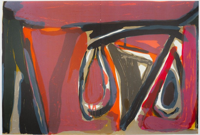 [Hommage an Aimé und Marguerite Maeght. - Lithografie]. - [1982]. -. Blattmaß: 38 x 55,5 cm (quer). Das Blatt des niederländischen Künstlers Bram van Velde (1895-1981) stammt aus der Künstleredition "Derrière le miroir No 250", die 1982 als Hommage an die Verleger Aimé und Marguerite Maeght erschienen ist. Die Hefte, die überwiegend mit Originalgrafik zeitgenössischer Künstler ausgestattet waren, erschienen zwischen 1946 und 1982 und gelten heute als wichtige Dokumente der Nachkriegskunst. - Mittig eine vertikale Falz und kleine Lochspuren der ehemaligen Fadenheftung. Verso bedruckt. Insgesamt gutes Exemplar.