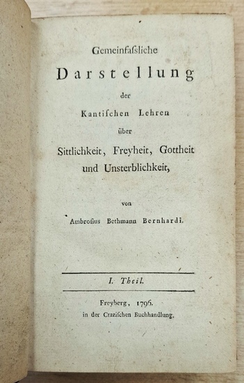 Gemeinfassliche Darstellung der Kantischen Lehren über Sittlichkeit, Freyheit, Gottheit und Unsterblichkeit. 2 Teile in 1 Band (alles). Freiberg, Crazische Buchhandlung, 1796/97. VIII, 598 S., 1 Bl. Inhaltsverzeichnis. Späterer Pappband. Wenige Seiten mit zarten Bleistiftanstreichungen. Alter Besitzerstempel auf Vorsatz. Gutes Exemplar. L.