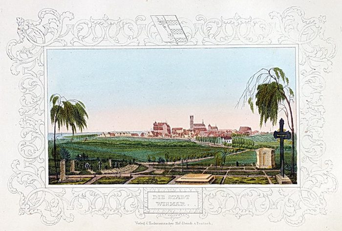 Die Stadt Wismar. J. G. Tiedemann'sche Hof-Steindruckerei, Schwerin, 1842. Ca. 13,5 x 20 cm (Blattgröße). Altkolorierte Lithographie. Partiell mit Gummi Arabicum gehöht. In vorzüglicher Erhaltung.