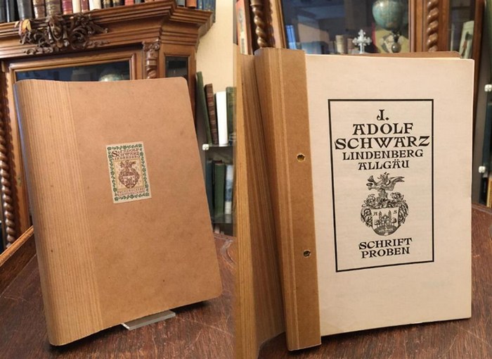 [Musterbuch] Schriftproben : J. Adolf Schwarz, Lindenberg Allgäu. Lindenberg, Buch- und Kunstdruckerei Adolf Schwarz, [ab etwa 1920]. 4° (25x17), ca. 200 S., Schnellheft-Mappe mit Druckerei-Deckelschild,. fest sauber und gepflegt, Musterbuch der Druckerei Schwarz in Lindenberg, enthält die erhältlichen Antiqua- und Fraktur-Schriften, sowie einige Spezialschriften (Schreibschrift/Kurrent) und Zierwerk (Initialen, Einfassungen, Vignetten).-- J. Adolf Schwarz gründete im Jahr 1899 eine Buch- und Kunstdruckerei in Lindenberg. Mit künstlerisch und drucktechnisch herausragenden Notgeld-Drucken machte er in den Jahren 1917 bis 1923 Lindenberg als 'Geldstadt' deutschlandweit bekannt.