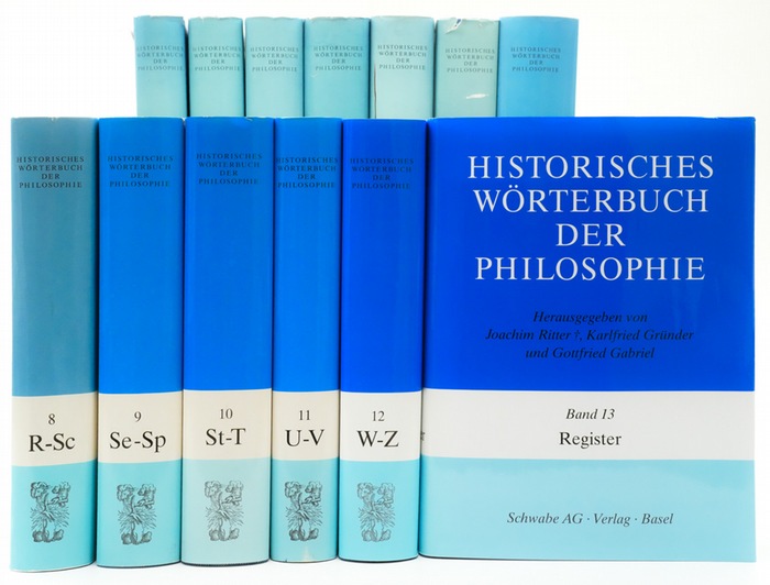 Historisches Wörterbuch der Philosophie. - [13 Bände]. - Basel (und Stuttgart):, Schwabe, 1971-2007. 13 Bände: beiliegende Siglen- und Korrekturblätter, goldgeprägte OLnbde., OU., 27 x 19,5 cm. 13 Bände (Bände 1 bis 12: A-Z; Band 13: Register). - Völlig neubearbeitete Ausgabe des Wörterbuchs der philosophischen Begriffe von Eisler. Hier vorliegend in der Original-Verlagsausgabe in goldgeprägten blauen Leinenbänden und mit blau-weiß-blauen Schutzumschlägen. - Ohne die beiliegende CD-Rom. - "In 12 Textbänden sowie einem abschliessenden Registerband dokumentiert das Lexikon in 17.144 Spalten und rund 6.000 Artikeln anhand zahlreicher präziser Belege und Stellenangaben Herkunft und Genese von insgesamt 3.670 philosophischen Begriffen und beschreibt den Wandel ihrer Bedeutung und Funktion von ihrem ersten Auftreten bis heute. Das Konzept der begriffsgeschichtlichen Methode macht sowohl synchronisch Stellung und Bedeutung einzelner Begriffe in bestimmten Epochen oder bei bestimmten Philosophinnen und Philosophen als auch diachronisch deren Bedeutungsveränderungen innerhalb der abendländischen Philosophiegeschichte nachvollziehbar. Um die spezifisch philosophische Begriffsarbeit im Kontext des gesamten Wissenschaftssystems zu veranschaulichen, werden zudem auch Begriffe aus angrenzenden Fachgebieten - Theologie, Psychologie, Pädagogik, Soziologie, Geschichte und Kunstgeschichte, Politik, Jurisprudenz, Medizin sowie aus den Naturwissenschaften - behandelt" (Verlagswerbung Schwabe). - Mit präzisen Stellenbelegen in ausführlichen Anmerkungsapparaten und Literaturlisten. - Provenienz: Katholische Sozialwissenschaftliche Zentralstelle, Mönchengladbach (Stempelsignatur mit handschriftlichem Austragungsvermerk auf Seite 4 aller Bände). - Die Schutzumschläge teils etwas lichtrandig, teils etwas angerändert, teils etwas knickspurig und teils minimal berieben (ein Schutzumschlag mit kleinem Riß, einer mit kleinem Ausbruch); der Kopfschnitt teils mit einer feinen Patina (Staub); sonst sehr gute Exemplare.