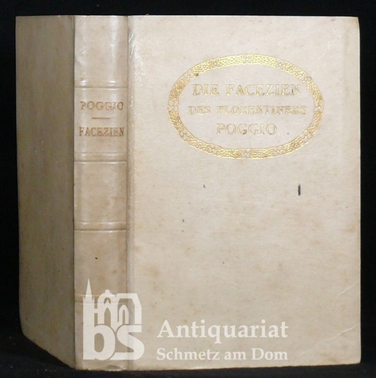 Die Facezien des Poggio Fiorentino. Aus dem Lateinischen übersetzt und eingeleitet von Hanns Floerke. Mit einem literaturhistorischen Anhang von Albert Wesselski. Privatdruck. 4to.XXXVIII,312 Seiten. Orig. -Pergamentband mit Rücken- u. Deckeltitel, Deckelvignette sowie Kopfgoldschnitt. München, Georg Müller 1906. 8°. XXXVIII, 312 S. Orig.-Pergament mit Rückentitel und Deckelvignette in Gold, Kopfgoldschnitt. Einband geringf. angestaubt, das letzte Bl. etwas stockfleckig. Kl. Ausriß am vorderen fl. Vorsatz. Die erste Lage gelockert. Minimal stockfleckig. Numeriertes Exemplar für Subskribenten. 25 Jahre Georg Müller S. 108 nennt 800 Exemplare, vorliegendes mit der Nummer 814. Hayn/Got. VI.222f. mit ausführlicher Würdigung: gehört "zu den Werken, die dadurch, daß sie die Fundamente der Macht Roms erschütterten und den Einfluß und die Autorität des Heiligen Stuhls beim Volke schwächen halfen, sehr zur Befreiung der Geister beigetragen haben".