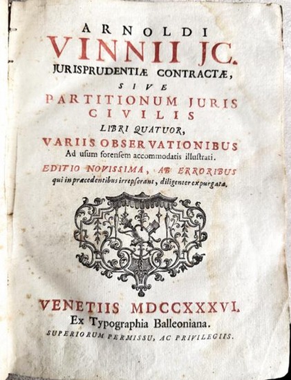 Jurisprudentiae contractae partitionum juris civilis. Libri Quatuor, variis observationibus... Venetiis, Typographia Balleoniana, 1736. XX, 515 Seiten. Gr. 8°, Pergament der Zeit ( Rücken oben mit Fehlstelle, etwas bestosen und fleckig, Innendeckel etwas stockfleckig). Arnold Vinnius (1588?1657) war ein bedeutender niederländischer Jurist und Professor. Seine Werke zur römischen Rechtslehre hatten großen Einfluss auf die juristische Ausbildung im Europa des 17. und 18. Jahrhunderts. Jurisprudentiae Contractae wurde vielfach als Standardwerk für die Praxis und Lehre des römischen und gemeinen Rechts verwendet und diente als Referenz für Richter, Anwälte und Forscher. Hier ist Band 4. - Text 2 spaltig. Seiten zum teil wasserrandig, etwas stockfleckig Ess2 . Bei Bestellungen auf Rechnung bleibt Vorkasse vorbehalten. Bestellungen erfolgen ohne Gewähr und gelten erst nach Bestätigung der Verfügbarkeit. Payment in advance is reserved for orders on account. Orders are made without guarantee and are only valid after availability has been confirmed. The shipping costs to non-EU countries may vary depending on the weight. We also offer cheaper shipping options for books up to 1000g.