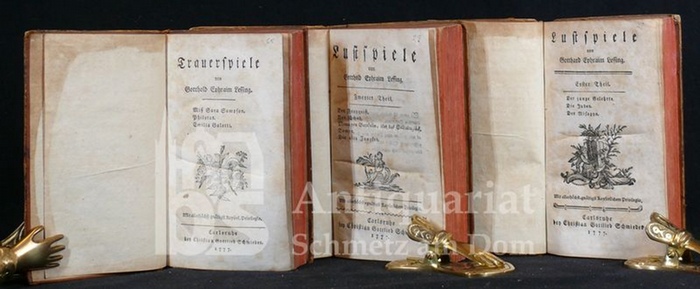Lustspiele. Erster (und Zweyter) Theil. (Und): Trauerspiele. Mit mehreren geschnittenen Vignetten. Karlsruhe, Schmieder 1777. 3 Bände. 1 Bl., 299 S.; 1 Bl., 484 S.; 1 Bl., 394 S. Ldr der Zt mit 2 Rückenschildern (Trauerspiele mit einem) Rückenschild. Berieben, Kapitale und Ecken teils auch leicht bestoßen. Deckel teils mit kl. Schabspur, ein Einband mit Wurmloch und kl. Wurmgang. Vorsätze gebräunt, teils etwas stockfleckig. Aus der ehemaligen von Clermont'schen Bibliothek, Vaalsbroich. Am Vorsatz hs. Eigentumvermerk 'Hasselbach'. - Unrechtmäßige Nachdrucke. Seifert 89 und 90. Muncker 448. Goed. IV.1.395.100 und 421f.123. Ohne die Reihentitel zu den 'Lustspielen'.