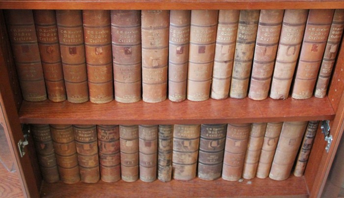 Vollständiges Bücher-Lexicon enthaltend alle von 1750 bis 1910 in Deutschland und in den angrenzenden Ländern gedruckten Bücher. 36 Bände (gebunden in 27) sowie 4 (der 6) Registerbände. Leipzig, Tauchnitz, 1834-1911. Lexikonformat. Orig.-Halblederbände. *Originalausgabe von Kayers Bücherlexikon. Erfasst wurden alle deutschsprachigen Verlagspublikationen der Jahre 1750 bis 1910. Die ersten 6 Bände umfassen den Zeitraum 1750 bis 1832 alphabetisch, danach in 5-Jahreszeiträumen. - Hervorragendes Quellenwerk, das auch dann noch wichtige Informationen liefert, wenn alle anderen Bibliographien versagen. Nur das GV ist vollständiger. - Vollständig in der Hauptreihe (und inklusive 4 der Registerbände, die für den Gebrauch eigentlich nicht benötigt werden). - Alter Stempel auf den Titelblättern, Rücken teils etwas berieben und Kapitale bei einigen Bänden bestoßen (4 Bände mit kleineren Fehlstellen an den Kapitalen). Teils leichte Gebrauchsspuren, insgesamt ordentliches und innen sauberes Exemplar.
